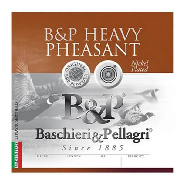 Baschieri & PellagriWith great range and with solid knock-down power, the B&P Heavy Pheasant line is designed to give you everything you need to take down birds with your first shot. Shoot with confidence, knowing that B&P Heavy Pheasant shotshells offer an excellent pattern, with high-velocity penetration giving you the precision and power needed to bag that bird at long distances.Specifications:Rounds Per Box: 25 ct.Brass Height: 16mmCase Type: Traditional HeadShot Type: Nickel Plated LeadWad Type: Plastic Wad w/ Shot ContainerNote: Nickel Plated Lead does not qualify as non-toxic.