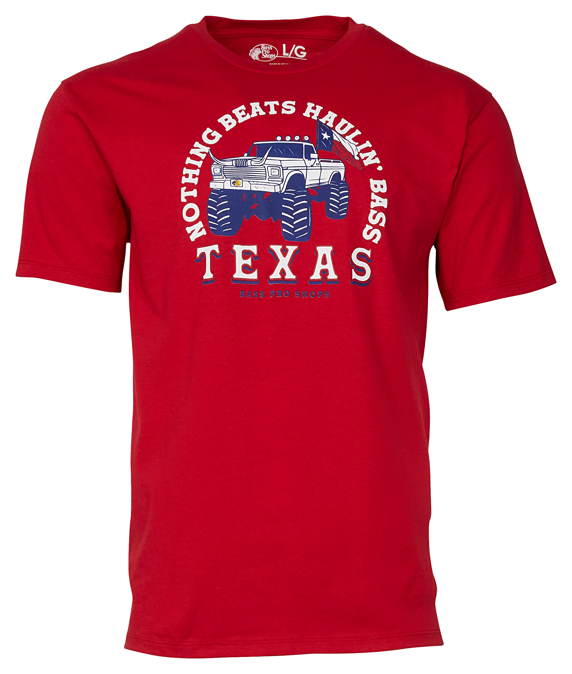 The screen-printed graphic on the front of the Bass Pro Shops Texas Haulin Bass Short-Sleeve T-Shirt is perfect for anyone that loves big Texas trucks! This lightweight and soft men's shirt features dropped sleeves, a straight hem, and ribbing on the crew-neck collar. Made of 100% cotton. Machine wash. Imported. Made of 100% cotton Texas truck graphic on the front Lightweight and soft feel Ribbed crew-neck collar Dropped sleeves Straight hem