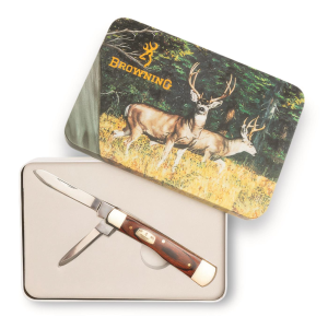 This classic BrowningA® Folding Knife with Gift Tin is a proud example of the brand's legendary dedication to the great outdoors. Ready for everyday carry in your pocket, from running errands around town to exploring the next turn in your trail. Packed in a handsome whitetail tin for easy presentation. 7Cr17MoV stainless steel 2.75" and 2" blades with nail nick opening Traditional gunstock handle with pakkawood scales and medallion inlay Nickel silver bolsters Packed in handsome whitetail gift tin