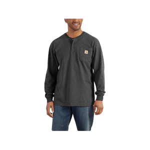 Since 1889, Carhartt has made durable workwear you can count on as you tackle the toughest jobs. This Carhartt Men's Loose Fit Heavyweight Long Sleeve Henley T-shirt is made of heavyweight cotton jersey and cut generously for a roomy fit.Features6.75-ounce, 100% cotton jersey knit; Heather Gray: 90% cotton / 10% polyester jersey knit; Carbon Heather: 60% Cotton / 40% PolyesterHenley collar with three-button frontRib-knit collar and cuffs hold their shape throughout the daySide-seam construction minimizes twistingLeft-chest pocket with sewn-on Carhartt patchTagless neck label for a smooth feel