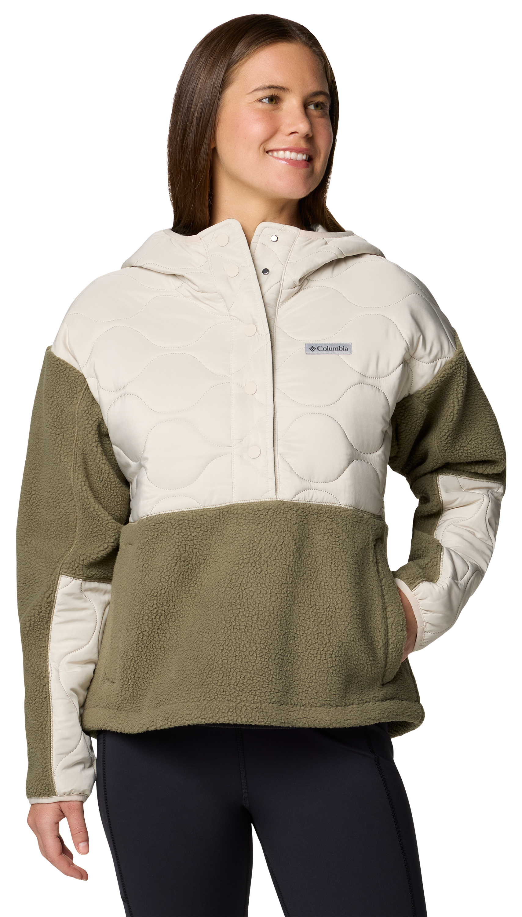 Keep the cold away with the Columbia Cloud PointGäó Fleece Hooded Jacket for Ladies. This warm fleece jacket features a 1/2 snap-close storm-flap placket and a 3-piece hood that you can bundle up with. The kangaroo pocket is perfect for warming up your hands. The drawcord-adjustable hem, as well as the stretch binding at the hood and cuffs, help you seal yourself away from the weather. 100% polyester. Machine wash. Imported.Manufacturer style #: 2085891. 100% polyester Kangaroo pocket Drawcord adjustable hem Stretch binding at hood and cuffs 3-piece hood 1/2 snap-close storm flap placket