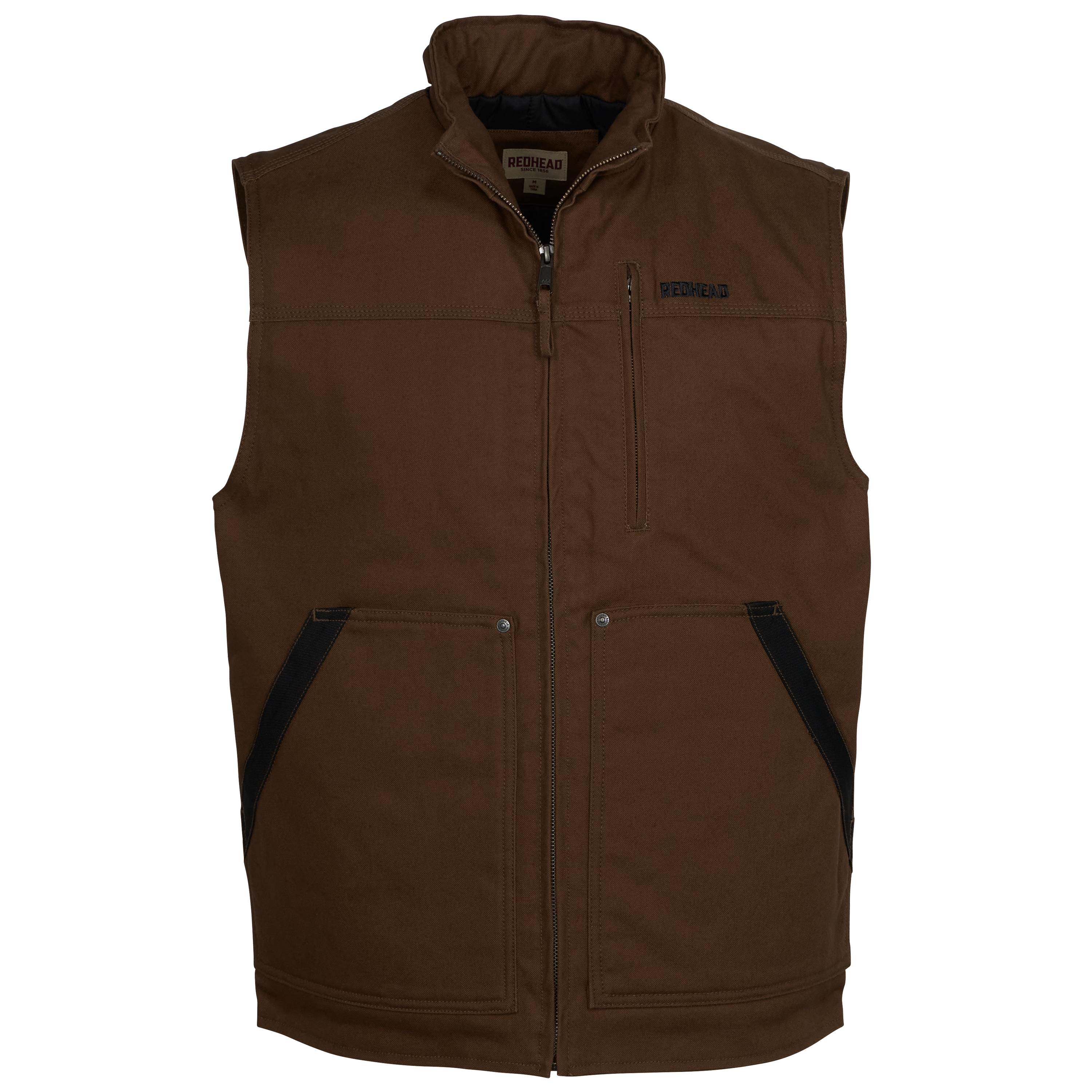 Layer up with the RedHead Pro Series Insulated Canvas Vest for Men. This work-ready RedHead vest stands up to tough jobs with its 380-gsm woven canvas body. The insulation and 60-gsm body lining work to keep you warm. The pockets feature brushed, knit tricot lining. Keep your gear in the zip chest pocket, dual handwarmer pockets with reinforced pocket openings, and internal security pocket. This vest is water-repellent and fights stains. The drop-tail hem provides extra coverage in the back. Body: 100% cotton. Body Lining: 100% nylon. Pocket Lining: 100% polyester. Machine wash. Imported. Body: 100% cotton Body Lining: 100% nylon Pocket Lining: 100% polyester 380-gsm woven canvas body 60-gsm body lining Brushed, knit tricot pocket linings Water-repellent Fights stains Internal security pocket Drop-tail hem Reinforced pocket openings on handwarmer pockets Zip chest pocket