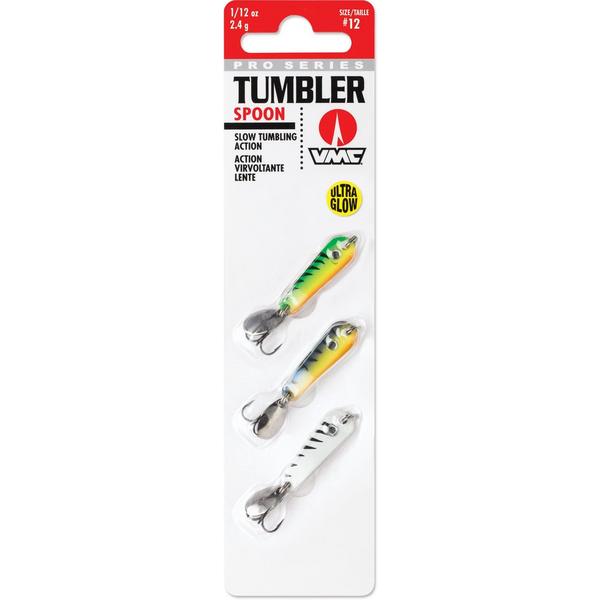 The VMC Tumbler Spoon is the ultimate one-two punch lure. It's unique "knuckle" bend offers a slow tumbling action for those finicky biters or when a subtle action spoon is critical to matching the behavior of neutral to negative fish. The knock-out blow is the addition of the small metallic attractor blade which adds additional flash and sound when coming in contact with the spoon and hook. Holographic Ultra Glow colors lasting up to 15 minutes, UV finishes, natural baitfish patterns, and holographic eye match the hatch to any fishing condition either on open water or under the frozen tundra!